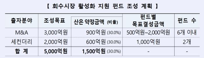 산업은행 출자금 1500억원을 마중물로 3000억원 규모의 인수합병(M&A) 펀드, 2000억원 규모의 세컨더리(구주매각) 펀드 등이 조성될 예정이다.