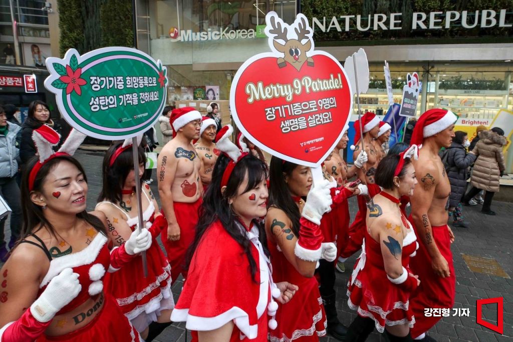 성탄절을 앞둔 20일 서울 중구 명동에서 스포츠트레이너들이 장기기증의 소중함을 알리는 '나인퍼레이드 캠페인'을 펼치고 있다. 사랑의장기기증운동본부가 주최하는 나인퍼레이드는 뇌사시 장기기증으로 9명의 생명을 구할 수 있다는 의미를 담은 캠페인이다.