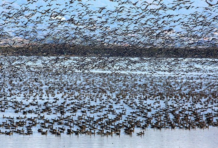 충남 서산시가 20일 서산버드랜드에서 2024 서산 천수만 생태사진 전국 공모전 시상식을 개최했다. 사진은 서산 천수만의 역동적인 기러기 군무를 포착한 이금숙 씨의 ‘천수만의 진객1’이란 금상 작품. /서산시