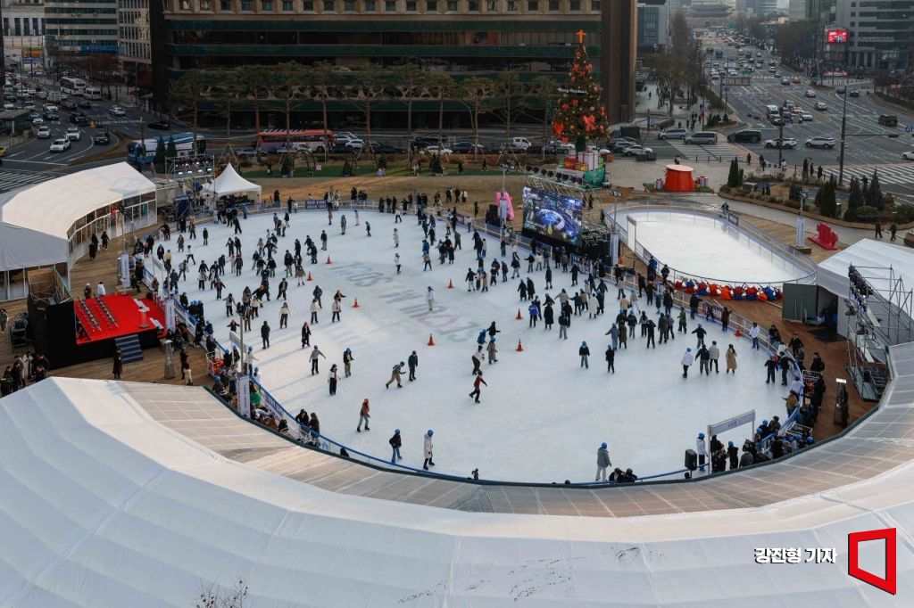 20일 서울 중구 서울광장에 마련된 야외스케이트장을 찾은 시민 및 외국인 관광객들이 스케이트를 타며 즐거운 시간을 보내고 있다. 서울시는 오늘부터 내년 2월 9일까지 52일간 서울광장 스케이트장을 운영한다고 밝혔다.