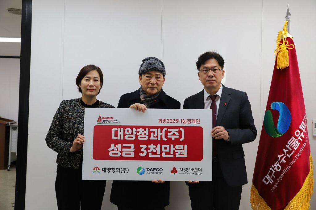 대구 도매시장법인 대양청과(주) 박기형 대표는 20일 대구농수산물유통관리공사에서 대구사회복지공동모금회를 통해 이웃 사랑 성금 3000만원을 기부했으며, 기부금은 소외된 이웃에게 전액 지원될 예정이다.