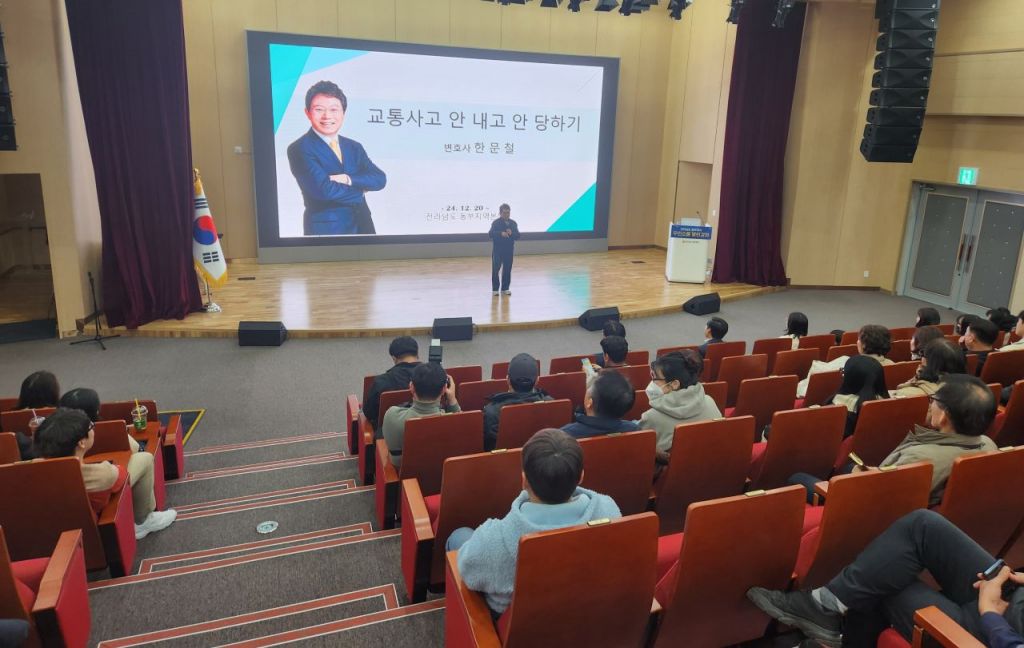 한문철 변호사가 '교통사고 안 내고 안 당하기'주제로 강연을 하고 있다. 전남도 동부지역본부 제공
