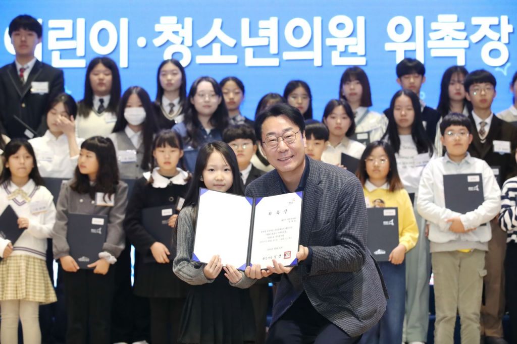 제8대 화성시 어린이·청소년의회 발대식에서 정명근 화성시장이 위촉장을 들어 보이고 있다. 화성시 제공