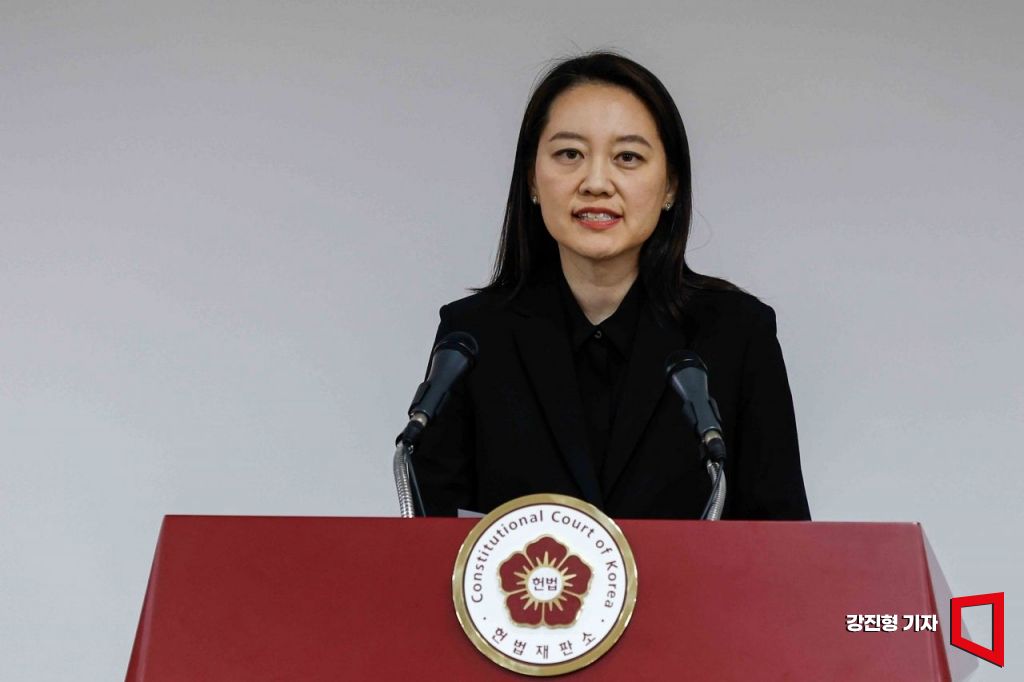 이진 헌법재판소 공보관이 23일 서울 종로구 헌법재판소에서 윤석열 대통령에게 전달되지 않고 있는 탄핵심판 서류들의 송달에 관한 공식 입장을 밝히고 있다.