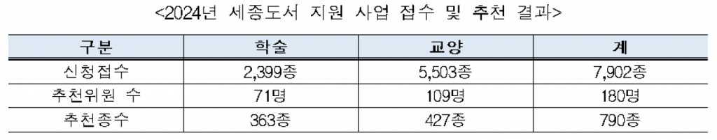 세종도서는 양서출판 의욕 진작 및 독서문화 향상을 위한 사업이다. 지난 7월 '2024년 세종도서 지원 사업(세종도서 사업)' 공고를 통해 7902종(학술 2399종, 교양 5503종)의 도서를 접수받았고 분과별 사전검토 및 1·2차 추천위원회의 심사를 거쳐 최종 추천도서 790종을 확정했다. 학술 363종, 교양 427종이다.