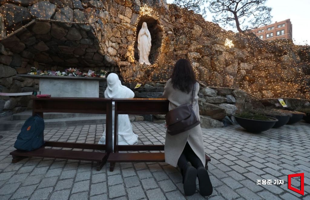 크리스마스를 하루 앞둔 24일 서울 중구 명동성당을 찾은 한 신자가 아기예수 탄생을 축하하며 기도 하고 있다.