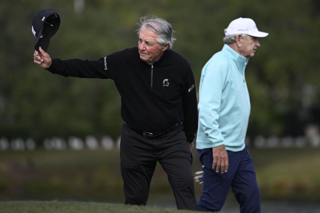 22일(현지시간) 미국 PNC 챔피언십 골프 토너먼트에 외손자와 출전한 게리 플레이어(왼쪽)가 갤러리들에 인사하고 있다. AP=연합뉴스