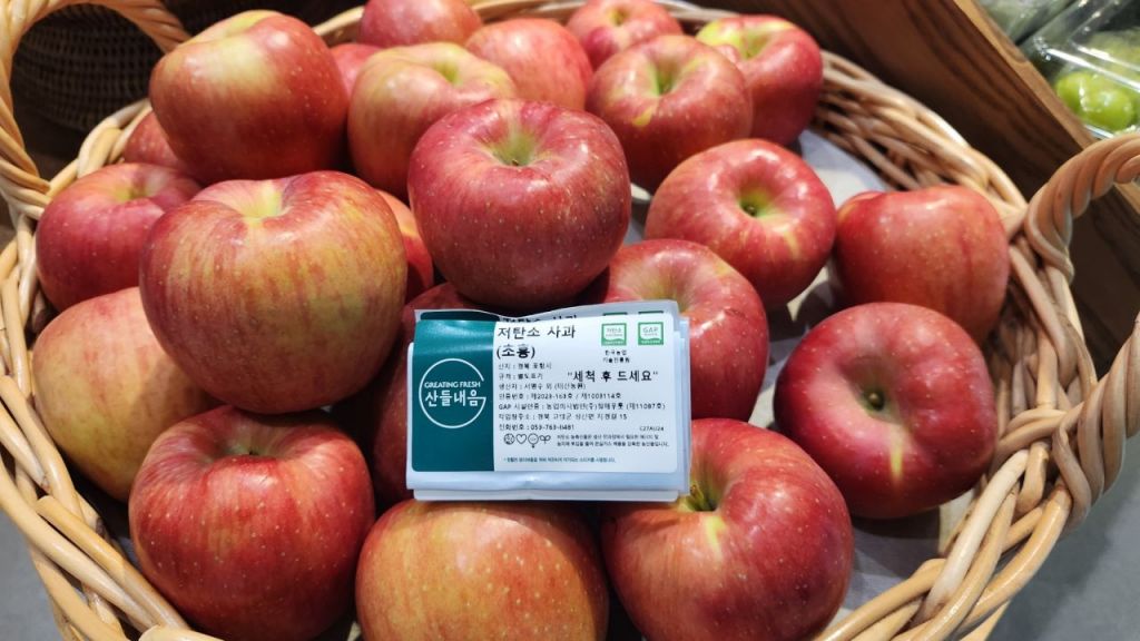 저탄소 농산물 인증을 받은 사과가 국내 대형백화점에 진열돼 있다. (사진제공= 농림축산식품부)