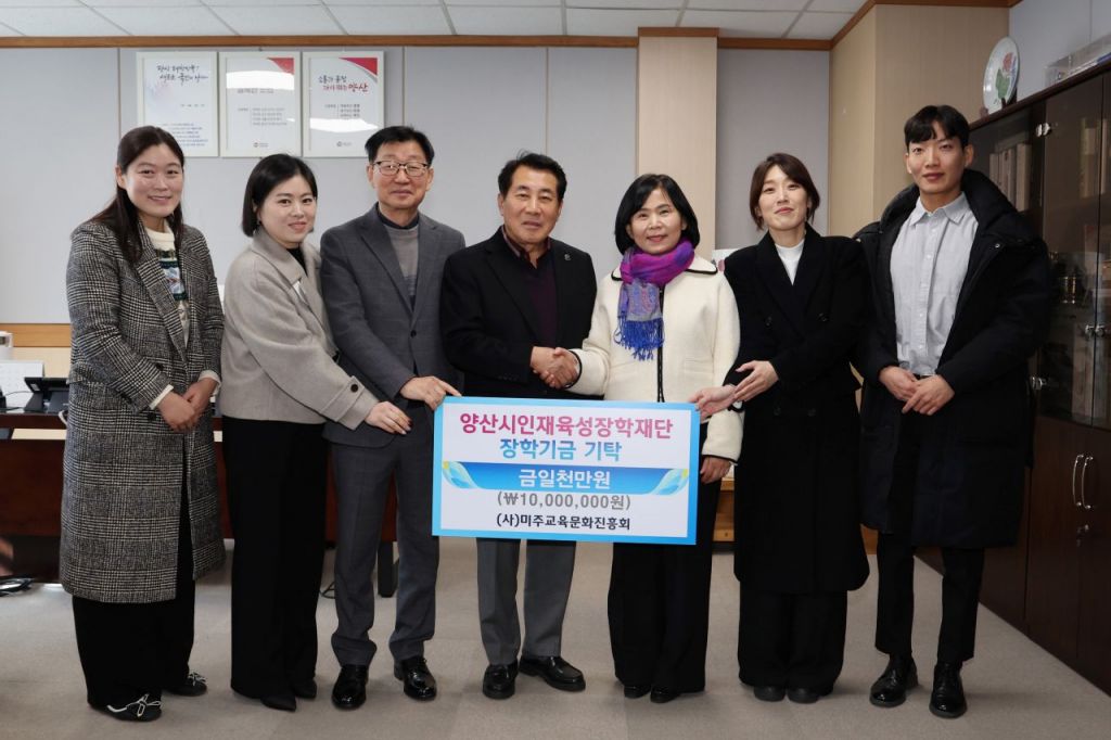미주교육문화진흥원은 23일 지역 인재육성을 위한 장학금 1000만원을 양산시인재육성장학재단에 기탁했다. 양산시 제공