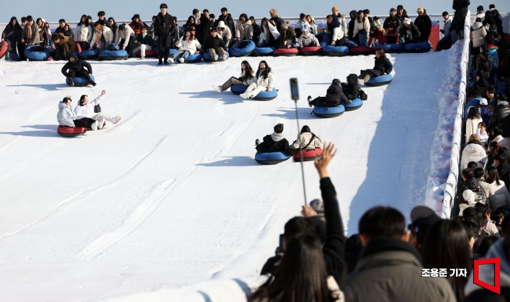 한강공원 눈썰매장 개장 첫날인 24일 서울 뚝섬 한강공원 눈썰매장을 찾은 시민과 외국인 관광객들이 눈썰매를 타며 즐거운 시간을 보내고 있다. 서울시는 이날부터 뚝섬, 잠원, 여의도 한강공원 눈썰매장을 개장해 내년 2월 16일까지 휴무 없이 오전 9시부터 오후 5시까지 운영한다.
