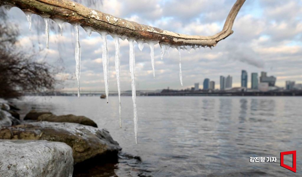 영하권 추위가 이어지고 있는 23일 서울 여의도 한강변 나뭇가지에 고드름이 걸려 있다. 강진형 기자