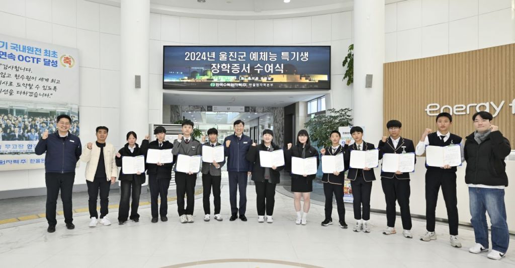 한국수력원자력 한울원자력본부는 한울본부 홍보관에서 체육꿈나무 육성을 위한 장학금을 울진군 체육특기생 75명에게 수여했다.
