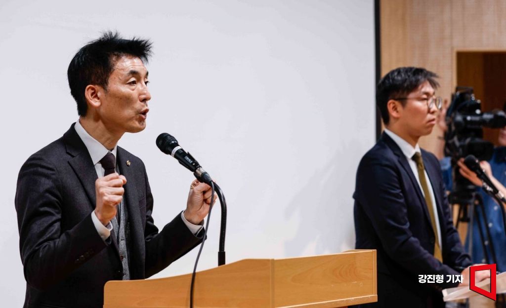 12.3 내란 사태로 수사를 받고 있는 김용현 전 국방부 장관 변호인단이 26일 서울 강남구 한국컨퍼런스센터에서 기자회견을 열고 입장을 발표하고 있다. 이날 변호인단은 MBC를 비롯한 일부 언론사는 "사실과 다르게 보도한다"고 주장하며 기자회견 참석을 제한했다.