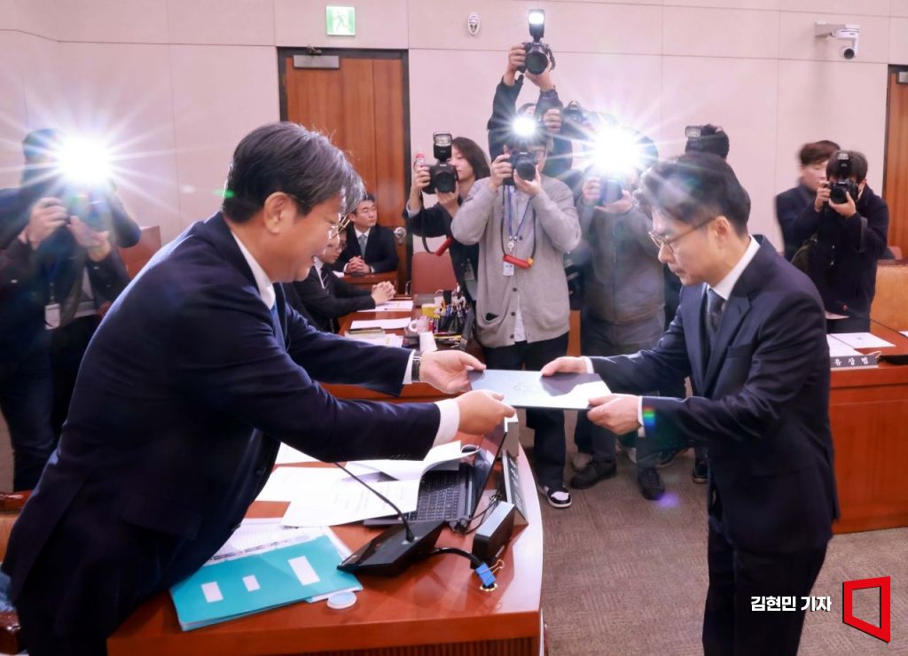 마용주 대법관 후보자가 26일 국회에서 열린 인사청문회에서 이춘석 위원장에게 선서문을 제출하고 있다.