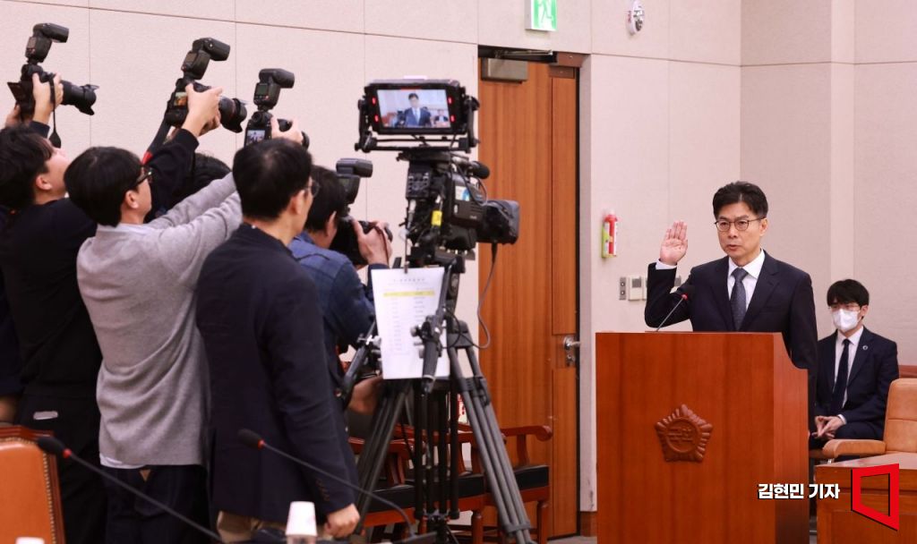 마용주 대법관 후보자가 26일 국회에서 열린 인사청문회에서 선서하고 있다.