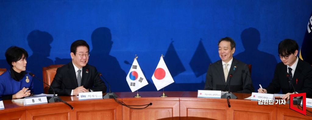 이재명 더불어민주당 대표가 26일 국회를 방문한 미즈시마 코이치 주한일본대사를 접견하고 있다.