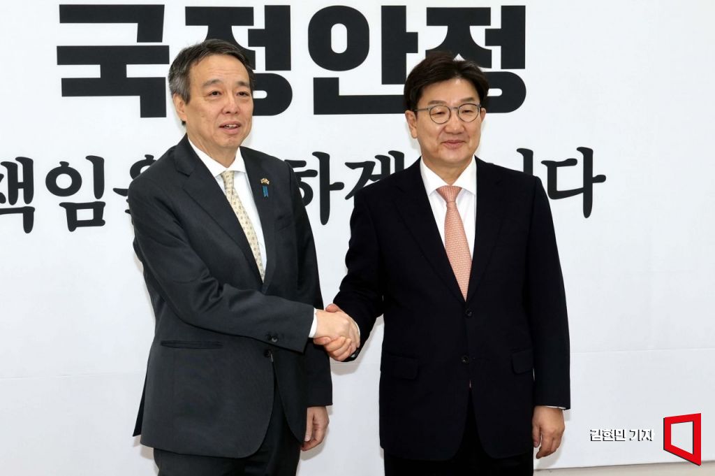 권성동 국민의힘 원내대표가 26일 국회에서 미즈시마 고이치 주한일본대사를 접견하고 있다.