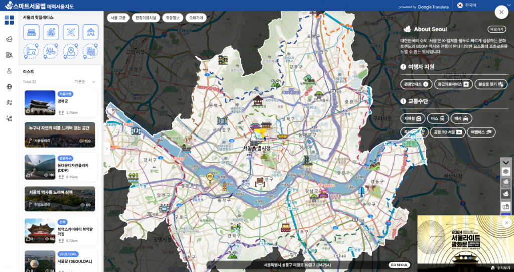 ‘매력서울지도’는 서울의 관광 매력 장소를 한 곳에서 확인할 수 있는 디지털 지도 서비스로 서울 여행을 계획하는 국내외 방문객에게 맞춤 정보를 제공한다.