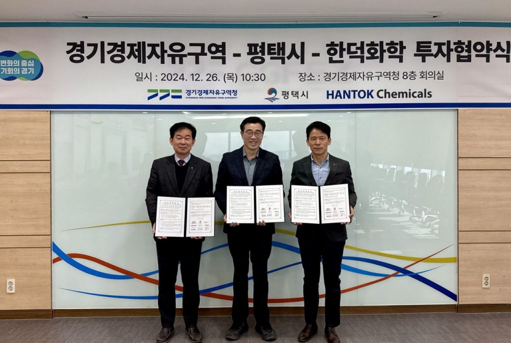경기경제청은 26일 반도체·디스플레이용 현상액(TMAH)을 생산하는 한덕화학이 평택 포승지구에 수도권 생산거점을 조성하기로 하고 택항마린센터 8층 회의실에서 롯데정밀화학, 한덕화학, 평택시와 투자협약을 체결했다고 밝혔다.