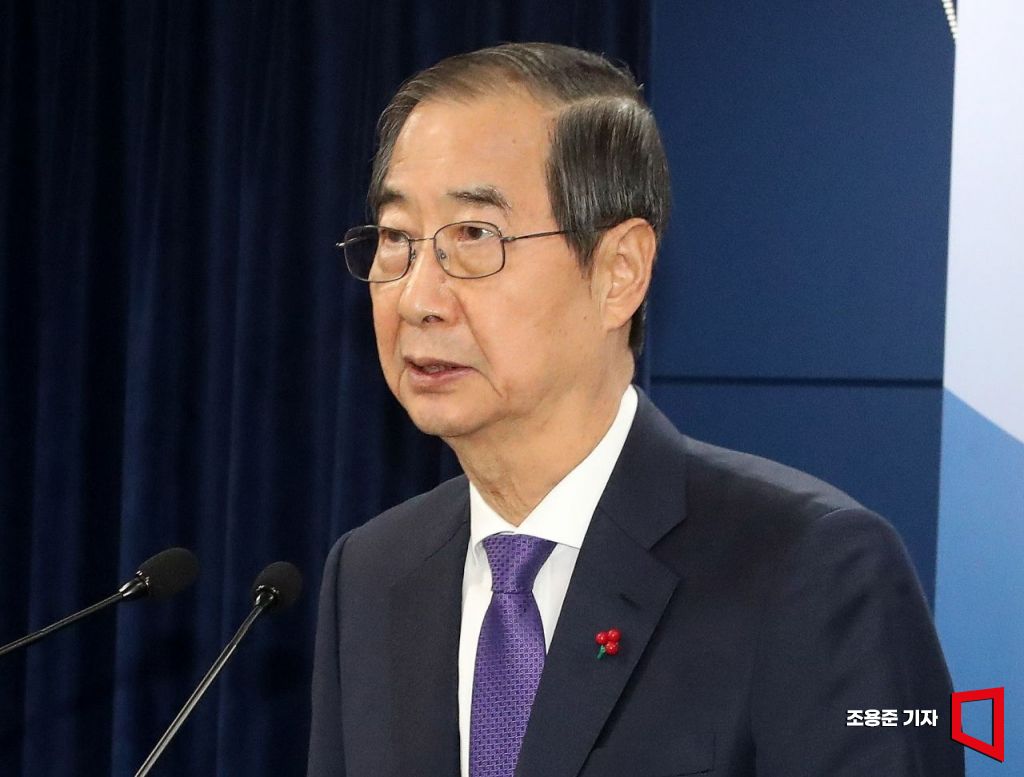 한덕수 대통령 권한대행 국무총리가 26일 서울 종로구 정부서울청사에서 긴급 대국민담화 발표하고 있다. 정부청사사진기자단