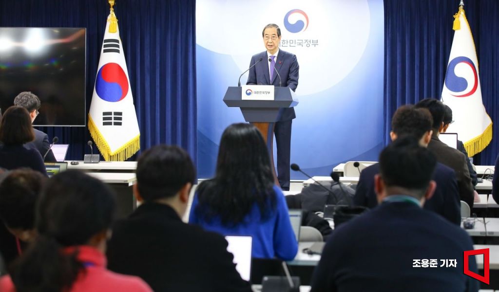 한덕수 대통령 권한대행 국무총리가 26일 서울 종로구 정부서울청사에서 긴급 대국민담화 발표하고 있다. 정부청사사진기자단