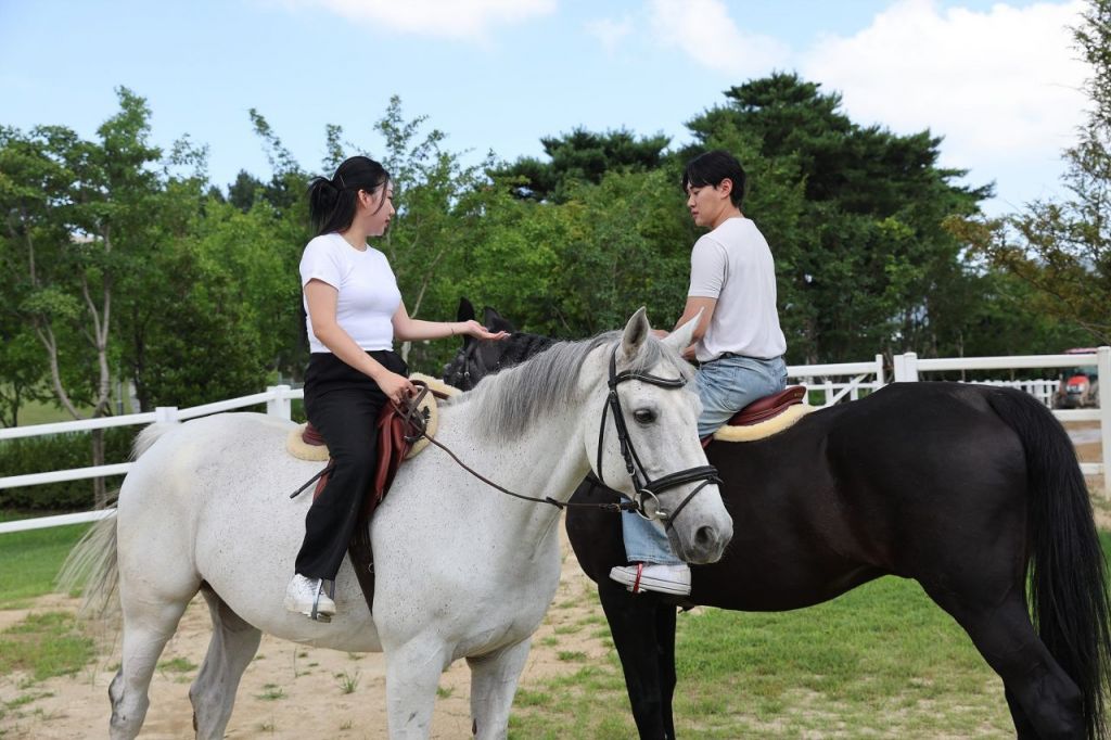 미혼남녀가 렛츠런파크 승마랜드에서 말과 함께 즐거운 한때를 보내고 있다.