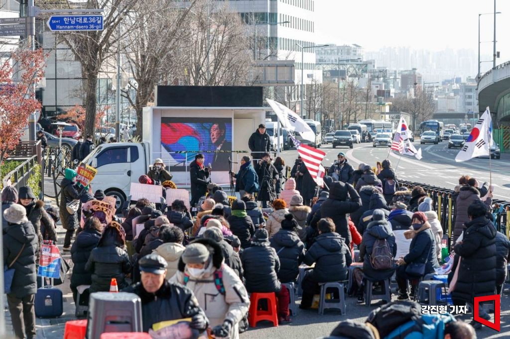 윤석열 대통령 탄핵심판 사건의 첫 변론준비 기일을 하루 앞둔 26일 서울 용산구 한남동 대통령관저 주변에서 보수단체 관계자들이 윤 대통령 탄핵 반대를 촉구하는 집회를 하고 있다.