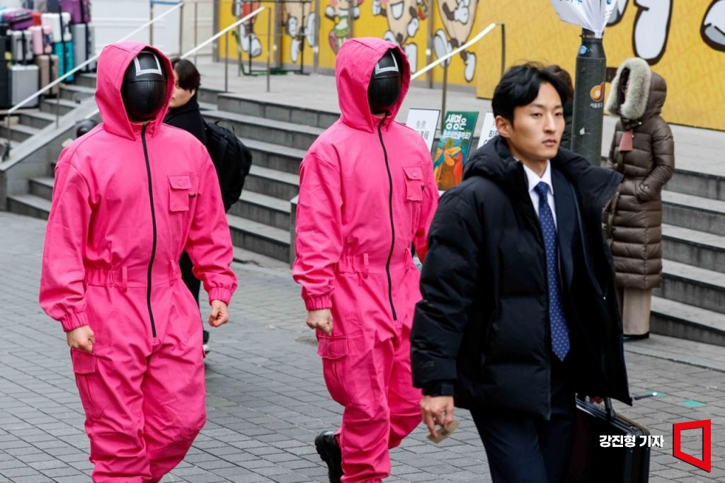 서울 명동역 인근에서 넷플릭스 드라마 오징어게임 시즌2 홍보 퍼포먼스가 진행되고 있다. 456억의 상금이 걸린 의문의 서바이벌 초대장을 받는다면 게임에 참가하시겠습니까?