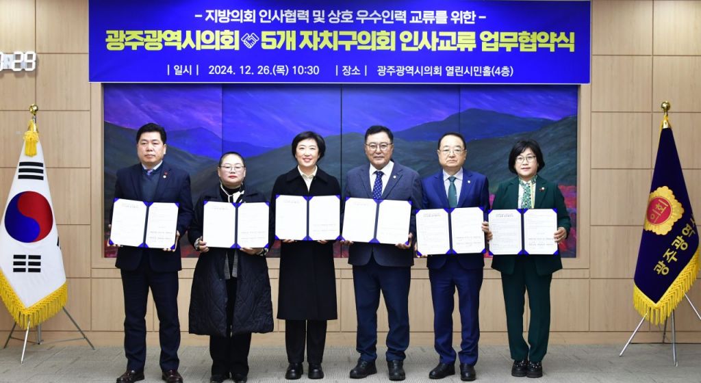 광주시의회(의장 신수정)와 5개 자치구의회(대표회장 김명수)가 26일 시의회 열린시민홀에서 인사교류 업무협약을 체결했다.
