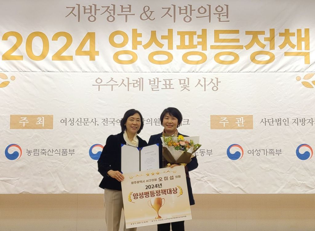 오미섭 광주 서구의원은 26일 양성평등정책대상에서 ‘여성신문&전여네(전국여성지방의원네트워크) 상’을 받았다. 오미섭 의원실 제공