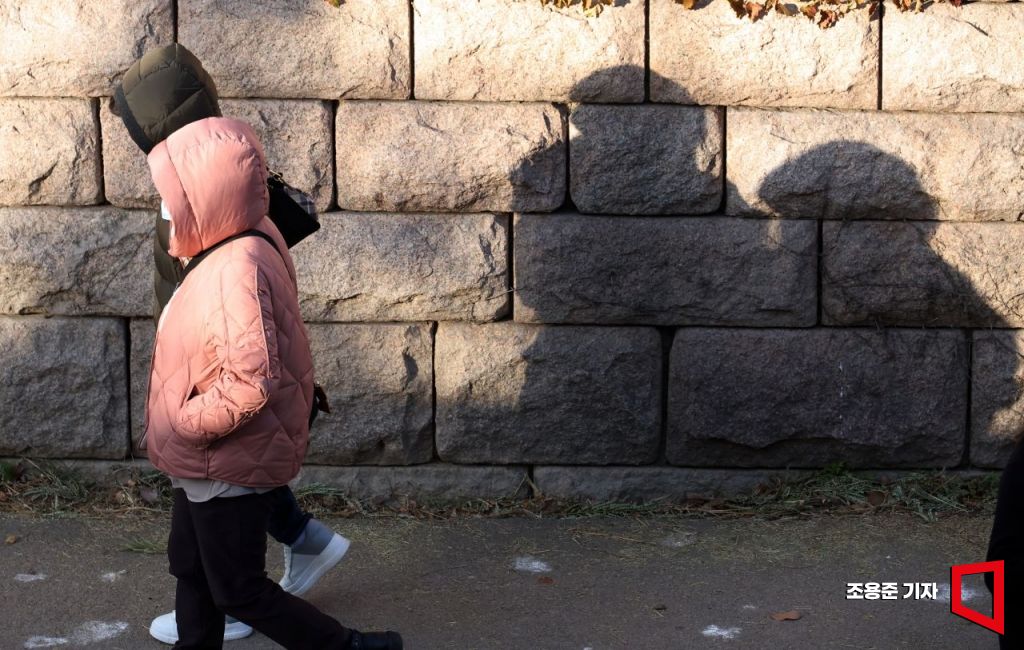 바람이 강하게 불며 다시 강추위가 몰려온 26일 오후 서울 종로구 청계천을 시민들이 두툼한 옷차림으로 산책하고 있다. 기상청은 이날 오후부터 기온이 뚝 떨어져 내일 아침기온이 영하 7도까지 내려가 강추위가 오겠다고 예보했다.