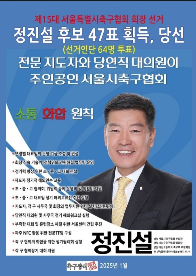 정진설 전 서초구축구협회장이 새로운 서울시축구협회장으로 선출됐다.