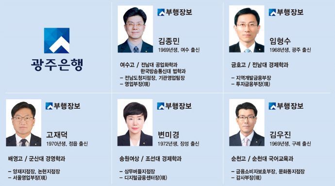 광주은행에 따르면 박종춘·조계준·양성현·한형구·정창주 부행장이 퇴임하고 김종민·임형수·고재덕·변미경·김우진 부행장보가 신임 부행장으로 선임됐다.