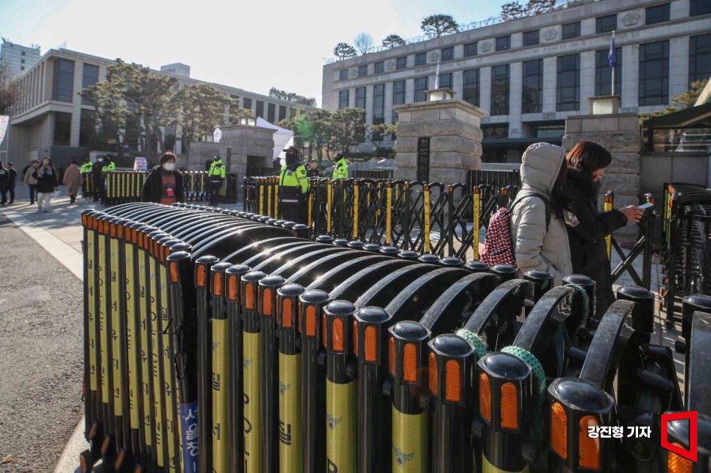헌법재판소가 윤석열 대통령에 대한 탄핵심판청구 사건을 심리 중인 가운데 23일 서울 종로구 헌법재판소 입구에서 경찰 병력 경계가 강화되고 있다. 강진형 기자