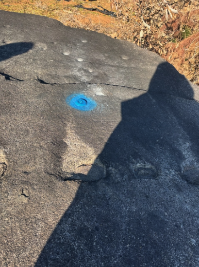 국토정보공사 측 직원들은 지난 10월 21일 창원시 의창구 동읍 봉산리에 있는 1호 고인돌(지석묘)에 약 10㎝ 길이 못 형태의 '지적 도근점'을 박았다. 지적 도근점은 건물과 대지 등의 측량을 위한 기준 표식이다. 창원시 제공