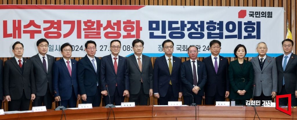 권성동 국민의힘 당 대표 권한대행 겸 원내대표와 최상목 경제부총리 겸 기획재정부 장관 등이 27일 국회에서 열린 내수경기활성화 민당정협의회에서 기념촬영을 하고 있다.