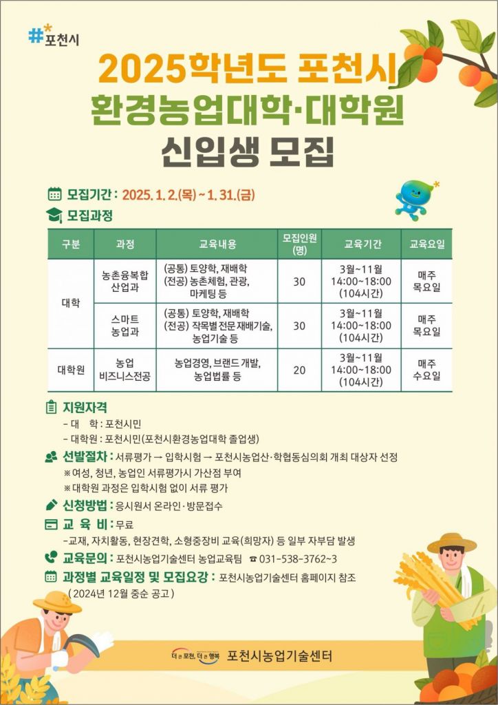 경기 포천시(시장 백영현)는 오는 2025년 1월 2일부터 1월 31일까지 2025학년도 포천시환경농업대학·대학원 신입생을 모집한다고 27일 밝혔다.