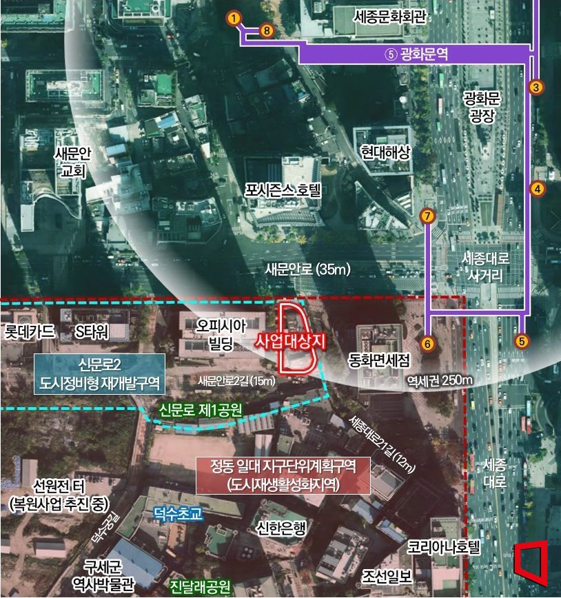 사업지는 인근에는 오피시아빌딩, 동화면세점 등 대규모 오피스 빌딩과 호텔 등이 밀집해있는 광화문 중심업무지구에 위치하고 있다. 공공재개발을 통해 도심 주거수요에 대응하고, 구역 내 잔여 정비기반시설(도로, 공원)을 기부채납해 주변 도시환경을 개선할 예정이다.