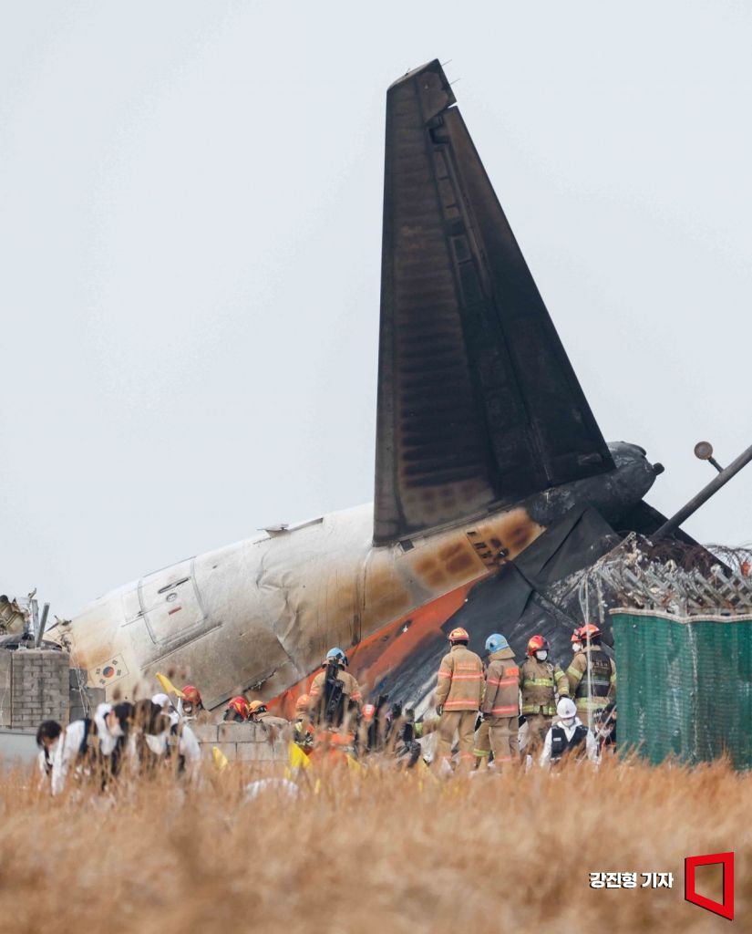 무안국제공항에서 탑승객 181명을 태운 제주항공 여객기가 착륙 중 활주로 외벽에 충돌한 뒤 화재가 발생해 승객 대부분이 사망하는 대참사가 발행한 29일 전남 무안국제공항 활주로 외부에서 과학수사대가 사상자를 수색하고 있다. 강진형 기자