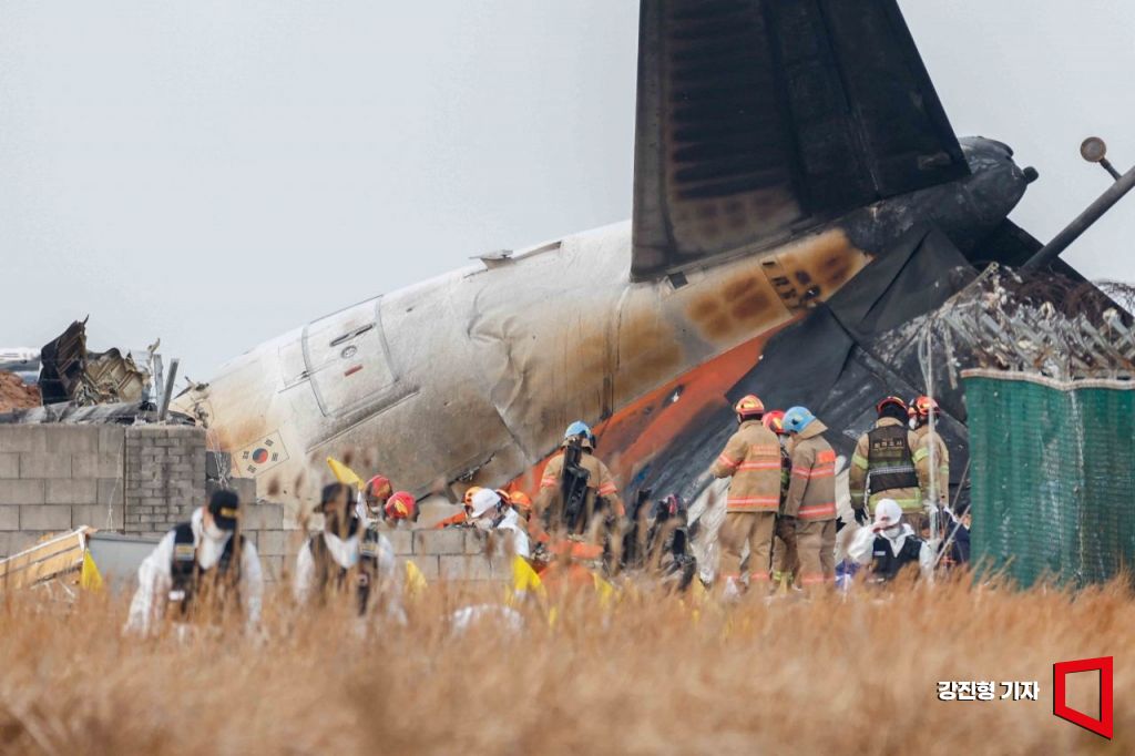무안국제공항에서 탑승객 181명을 태운 제주항공 여객기가 착륙 중 활주로 외벽에 충돌한 뒤 화재가 발생해 승객 대부분이 사망하는 대참사가 발행한 29일 전남 무안국제공항 활주로 외부에서 과학수사대가 사상자를 수색하고 있다. 강진형 기자