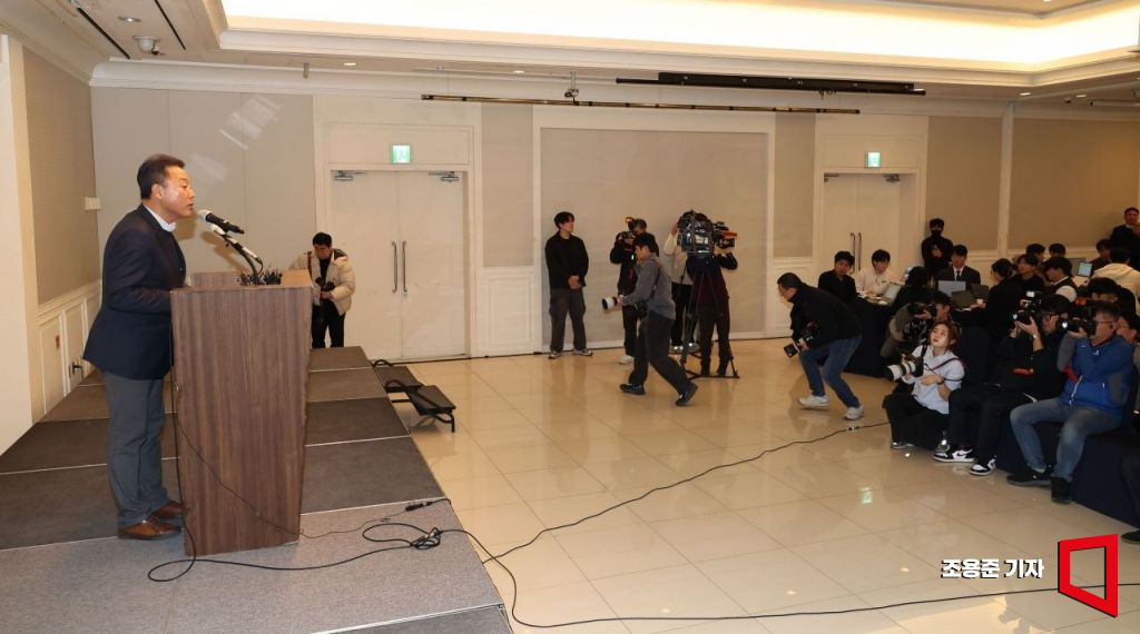 제주항공 송경훈 경영지원본부장이 30일 서울 강서구 메이필드 호텔에서 무안 제주항공 참사 관련 브리핑을 하고 있다.