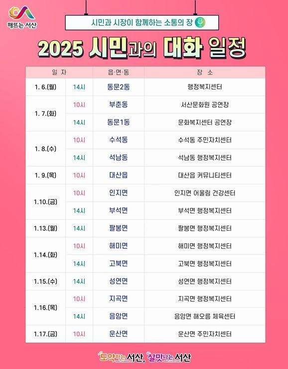 서산시는 1월 6일부터 17일까지 ‘2025년 시민과 대화’를 진행한다고 30일 밝혔다.