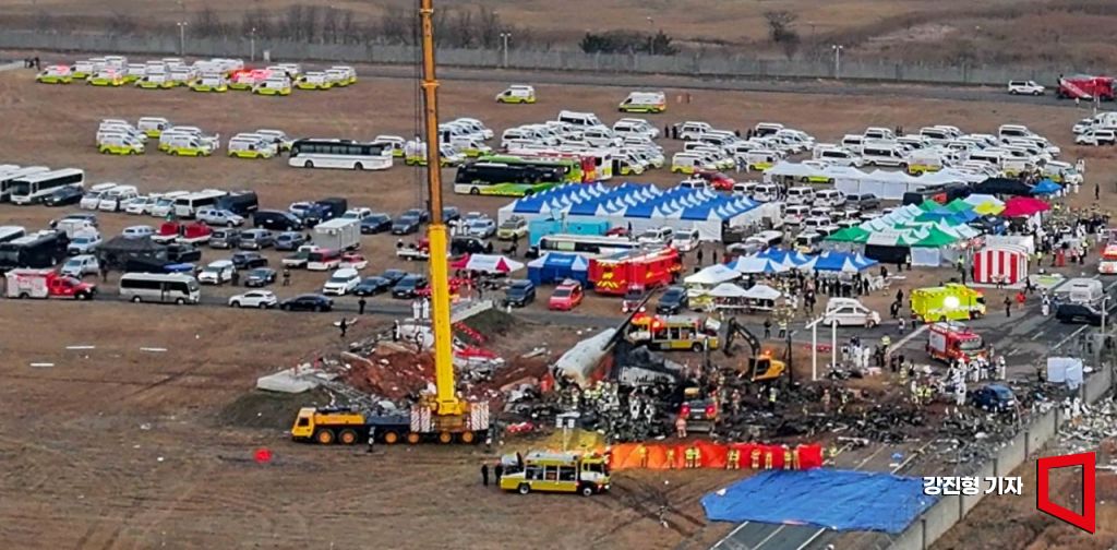무안국제공항에서 탑승객 181명을 태운 제주항공 여객기가 착륙 중 활주로 외벽에 충돌한 뒤 화재가 발생해 승객 대부분이 사망하는 대참사가 발행한 29일 전남 무안국제공항 활주로에 사고 기체 잔해가 놓여 있다. 강진형 기자