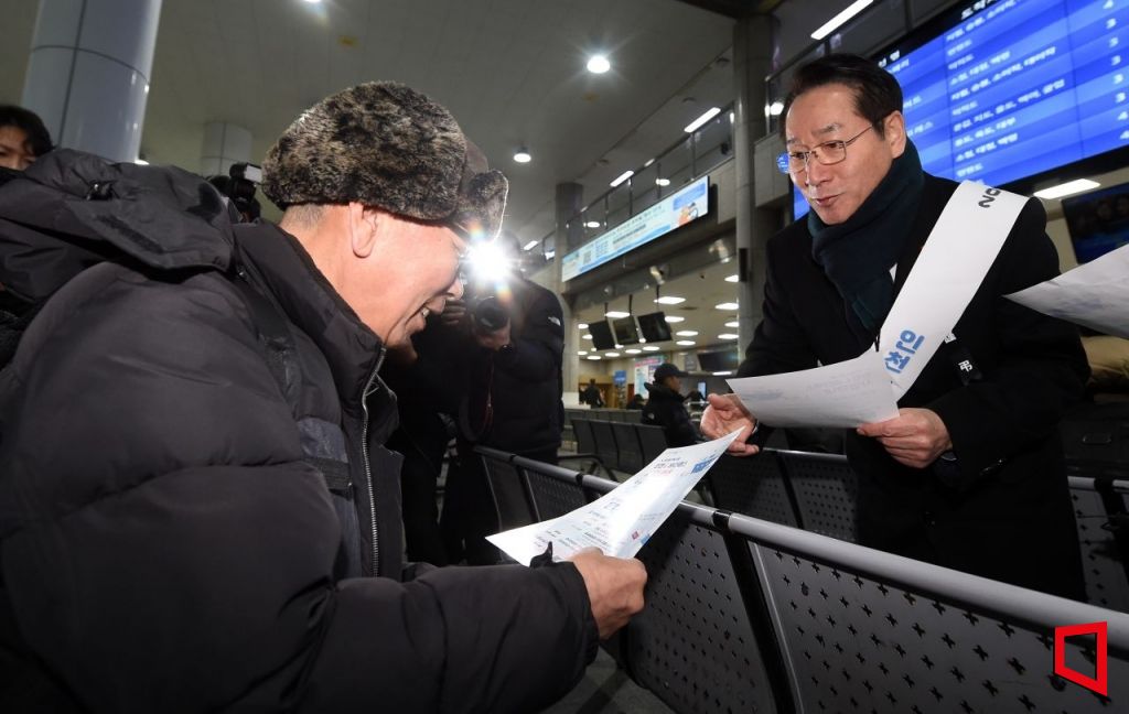 유정복 인천시장이 2일 인천항연안여객터미널에서 여객선 이용객들에게 '인천 I-바다패스'를 홍보하고 있다. 인천시 제공