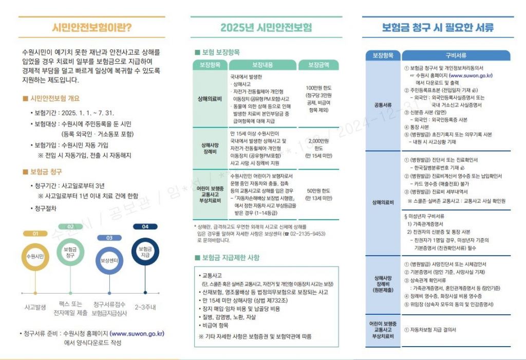 수원시 홈페이지(https://www.suwon.go.kr) 검색창에서 ‘시민안전보험’을 검색해 보장 항목·한도 등 자세한 내용을 볼 수 있다.
