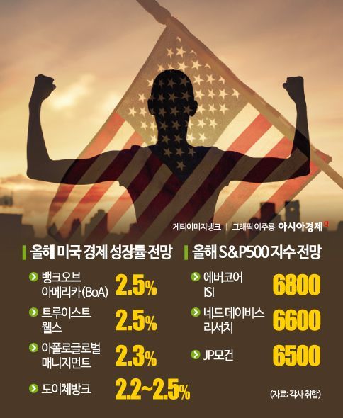 2일 각 기관이 내놓은 올해 미국 국내총생산(GDP) 성장률 전망치를 취합한 결과, 뱅크오브아메리카(BoA) 및 트루이스트 웰스는 2.5%, 아폴로글로벌매니지먼트는 2.3%, 도이체방크는 2.2~2.5%를 제시했다. 이는 국제통화기금(IMF)이 예측한 작년 GDP 성장률 전망치(2.8%) 대비 둔화한 수준이지만 일본·프랑스(1.1%), 영국(1.5%) 등 주요 7개국(G7)보다 훨씬 높은 수준을 유지했다.