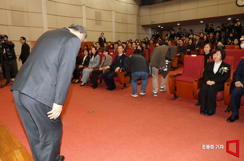 2일 서울 중구 헌법재판소 대강당에서 열린 신임 재판관 취임식에서 조한창 신임 재판관이 인사하고 있다. 헌재는 새해를 맞아 8인 재판관 체제를 이뤄 윤석열 대통령의 탄핵 심판에 속도를 낼 것으로 예상된다.