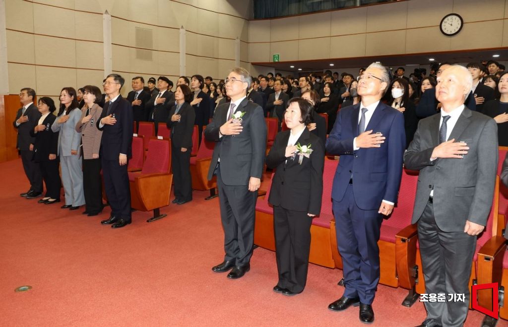 2일 서울 중구 헌법재판소 대강당에서 열린 신임 재판관 취임식에서 정계선(오른쪽 세번째), 조한창(오른쪽 네번째) 신임 재판관을 비롯한 재판관들이 국민의례를 하고 있다. 헌재는 새해를 맞아 8인 재판관 체제를 이뤄 윤석열 대통령의 탄핵 심판에 속도를 낼 것으로 예상된다.