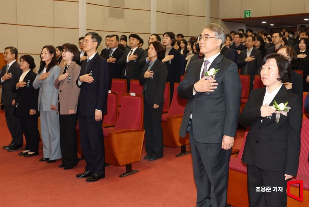 2일 서울 중구 헌법재판소 대강당에서 열린 신임 재판관 취임식에서 정계선(오른쪽), 조한창(오른쪽 두번째) 신임 재판관을 비롯한 재판관들이 국민의례를 하고 있다. 헌재는 새해를 맞아 8인 재판관 체제를 이뤄 윤석열 대통령의 탄핵 심판에 속도를 낼 것으로 예상된다.