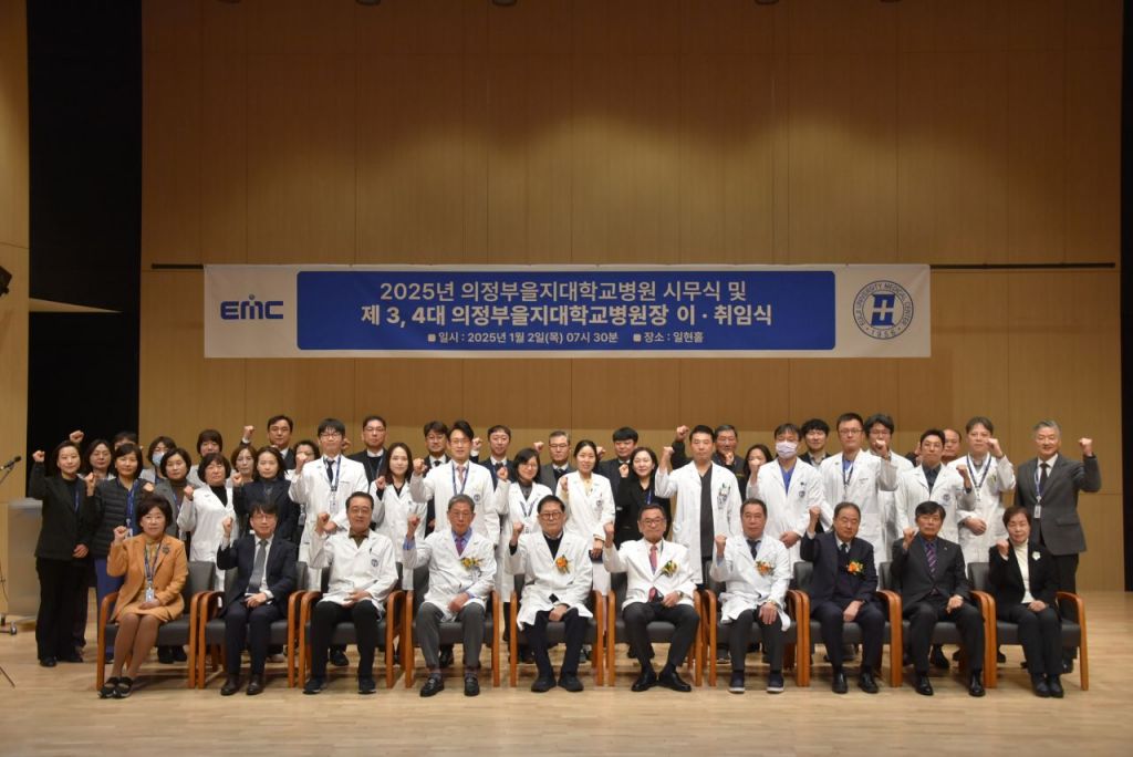 의정부을지대병원은 2일 을지대병원 3층 일현홀에서 '2025년 시무식 및 제3, 4대 병원장 취임식'을 개최한 뒤 참석자들과 기념촬영을 하고 있다. 을지대병원 제공